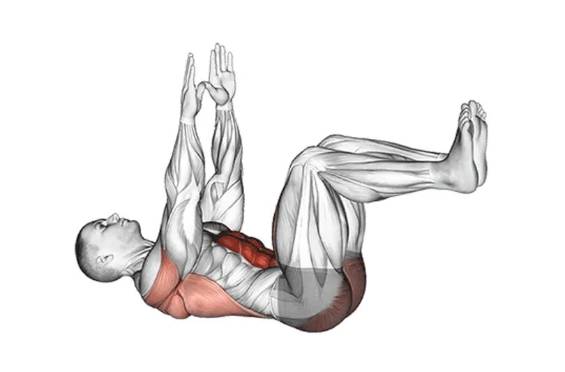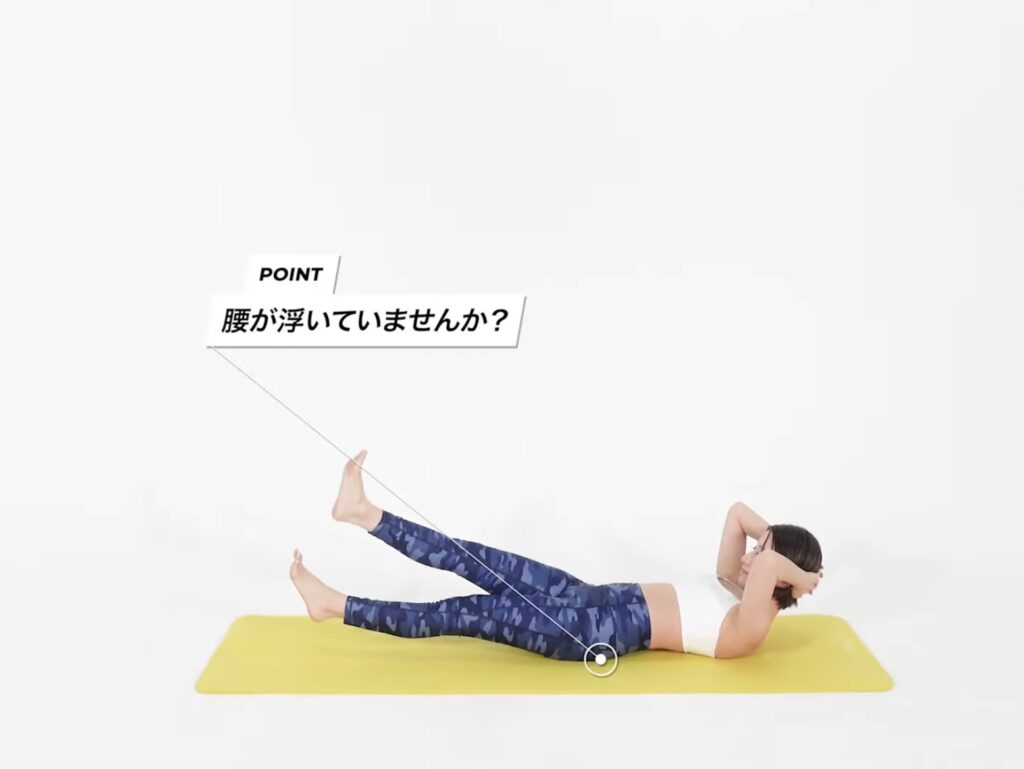 1.仰向けに寝て、両手を体の横に置きます。(この時に余裕があれば、手を頭の後ろで組んで上半身を起こすことができるとより効果的です。)