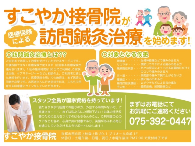 ご自身でもご家族様でも、お知り合いの方でも、どなたでも治療に向かわせて頂きますので、ご希望の方はすこやか接骨院までご連絡お待ちしております。