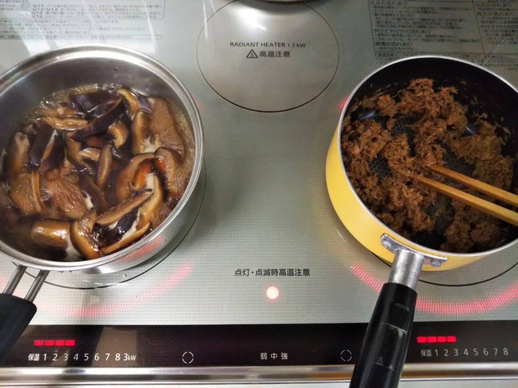 左→戻した椎茸を砂糖とみりんと醤油で甘く煮てます。