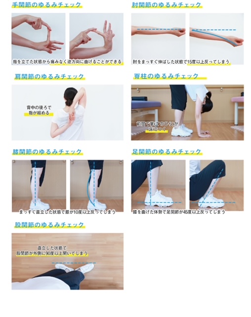 関節が緩い状態がどの程度なのか、簡単に行えるセルフチェックがあります。全部で7項目です。4つ以上該当すると関節弛緩の可能性があります。一度試してください。