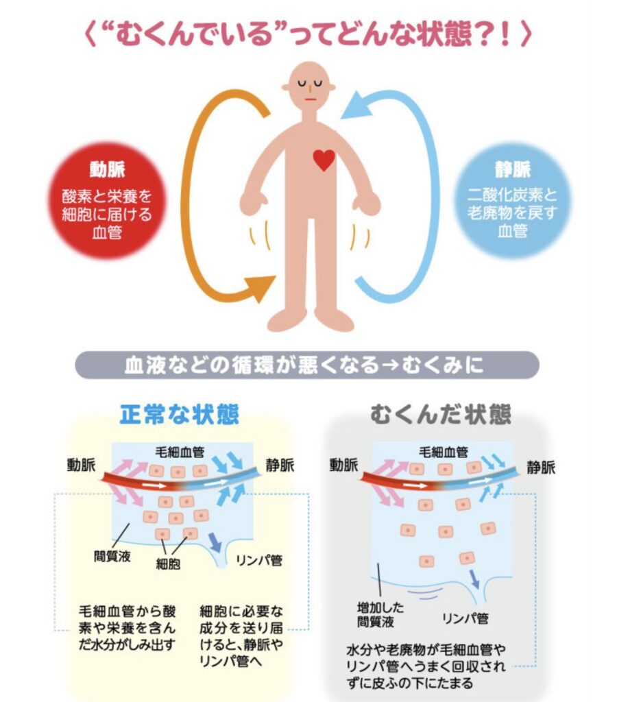 まずむくみとは、血液やリンパ液などの循環が悪くなり、水分が停滞した状態のことで原因としては、運動不足や血行不良、食事の偏りなど、さまざまなことが考えられます。