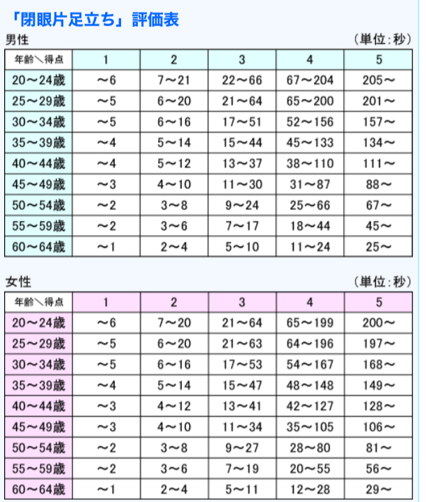 下記の表も参考にして頂き、どれぐらい平衡感覚があるか測定してみましょう!