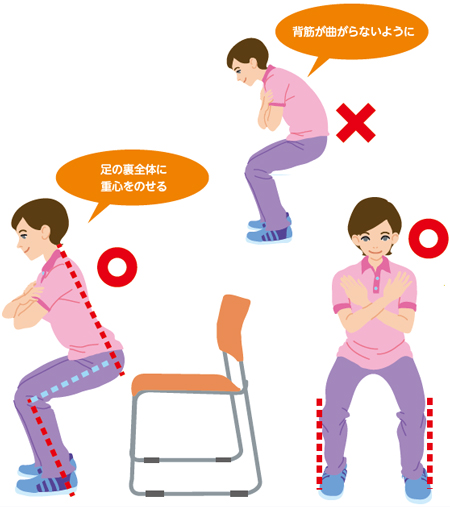 ①いすから立ち上がって足を腰幅に開き、両手を胸の前で交差する。