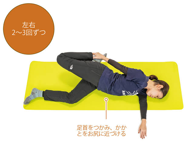 ※下になってる膝をしっかり曲げてあげるとより大腿四頭筋が伸びます。