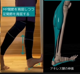 体重を少しかけながら、ふくらはぎと足裏を伸す